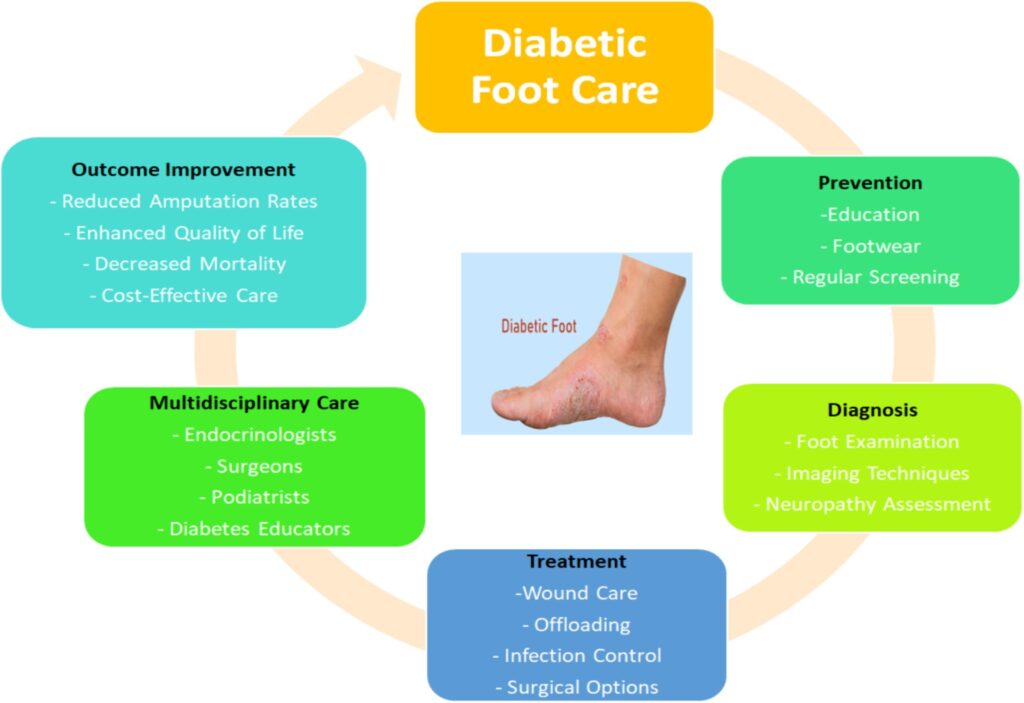Diabetic foot management involves teamwork among doctors, nurses, patients, and families, focusing on early diagnosis, advanced wound care, and continuous patient education for diabetes prevention and full life.